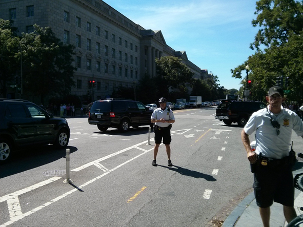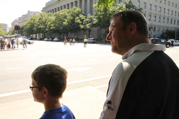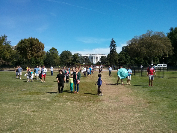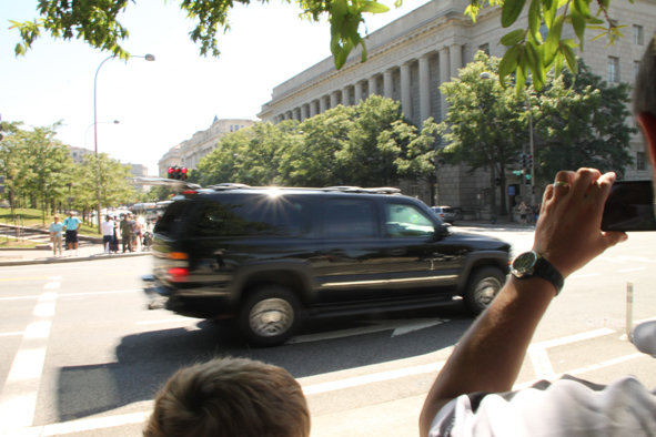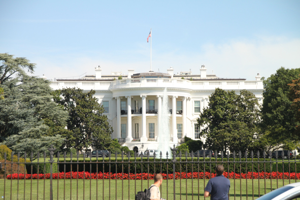 Day Two in DC and plenty to see. First, we headed down to the White House … only to be stopped in our tracks by Secret Service guys from proceeding any further. We had to stop (in the shade) and just wait. Eventually five 4×4’s headed into the White House grounds – one with the trunk window open and weapons visible. No President though in this cavalcade!