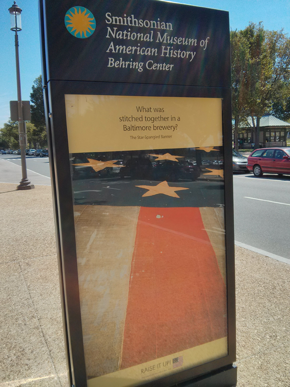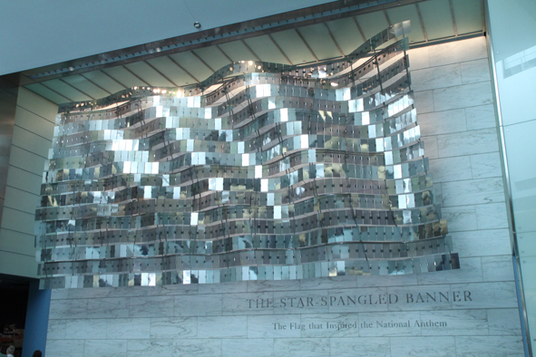 Sept 2014 marks the 200th Anniversary of the Star Spangled Banner – the flag that inspired the US National Anthem. The original is in display at the Smithsonian Museum of American History. The flag was first flown after the US won the Battle at Baltimore against the British and the words for the Star Spangled Banner were penned after seeing the flag being flown. No photos of the original flag were permitted. They had preserved the flag the best they could – segments had been cut out of the flag in the past to be kept as souvenirs!