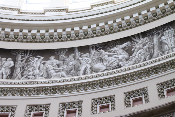 First stop was the crypt and we are able to stand at the heart of DC – the start where all the districts radiate out from. You can be in NW, NE, SW, SE DC at the same time! The star was very dipped after so many people had stood there over the years. From the crypt, we headed to the old Supreme Court Room / Court Room and then headed up to the Rotunda Foyer. Unfortunately, there was a cloth “donut” attached inside the rotunda as there’s repair work going on, but the very top of the mural was still visible and Lauren pointed out the key figures. There’s a very impressive frieze inside the rotunda too, depicting the history of the US – it took 75 years to complete!