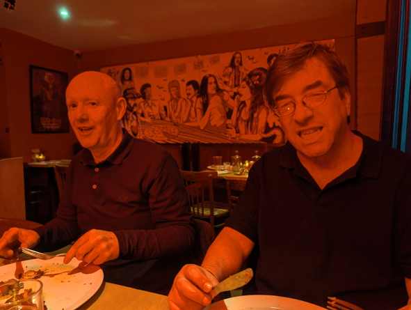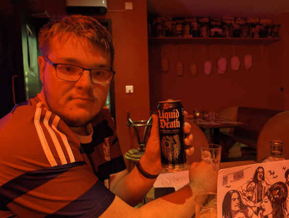 Twenty minutes later we’d arrived at the place, five minutes ahead of our booking. The place is only small and our table was downstairs in the crypt. There wasn’t a huge choice of meaty pizzas (chicken, pepperoni or ham) and this place added a sprinkle of charcoal into their pizza dough. They were without doubt the nicest pizzas we’d had for a very long time. Loads of meat toppings as in the majority of places, these are lacking. Interesting on the drinks menu was Liquid Death. Callum and Jon opted for this … it’s a drink inspired by the festivals for those that don’t want to be seen as not drinking. It’s sparkling water in a designer can that looks like a craft beer or cider.
