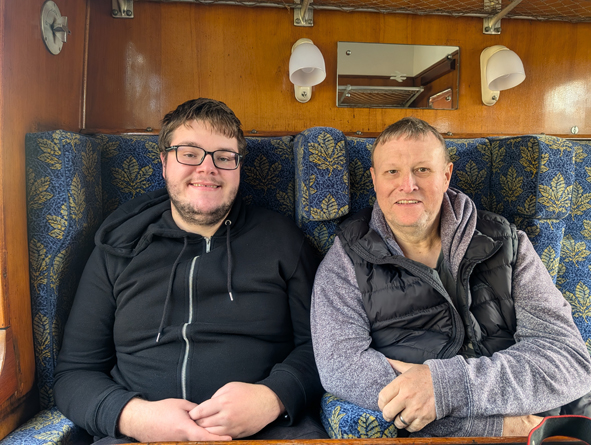 A train arrived heading to Cheltenham and the platforms cleared of passengers. We wanted to head towards Broadway and realised the trains were running late should would be able to catch the next train. We were lucky enough to get seats in First Class … and by sheer co-incidence, we ended up in a renovated carriage that used the Horse Chestnut design I’d liked!