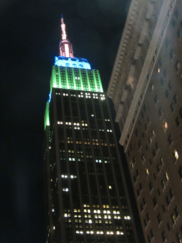 Subway and back to the hotel to cool down before heading out for the evening meal. We found a little French restaurant next to the Radisson Hotel. I opted for a Cobb Salad (again!) and Jon and Callum tucked into a bowl of mussels with frites! Callum declared he was full and was also tired so no pudding for us! As we walked back to our hotel, we noticed the Empire State was lit up in colour.