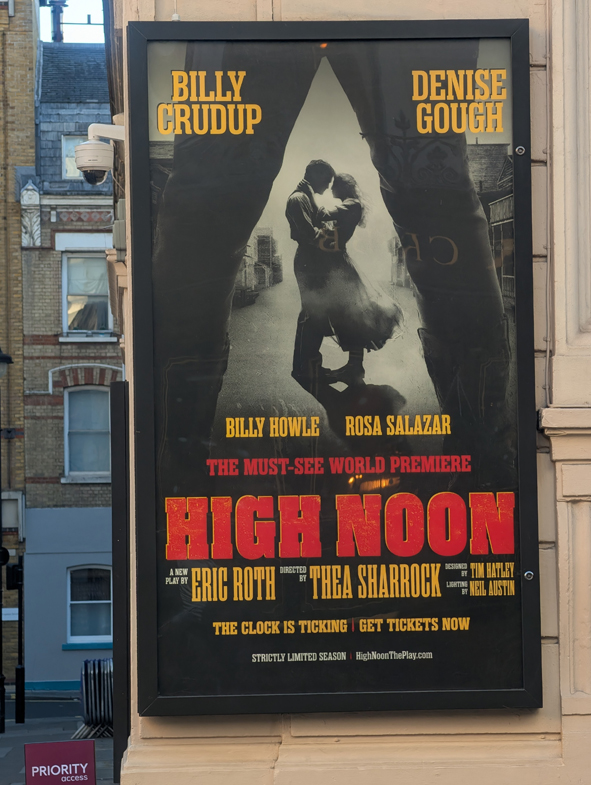 High Noon was on stage at The Harold Pinter Theatre. What looked small from the outside was like a tardis on the inside. Stalls plus 3 levels of balconies.
