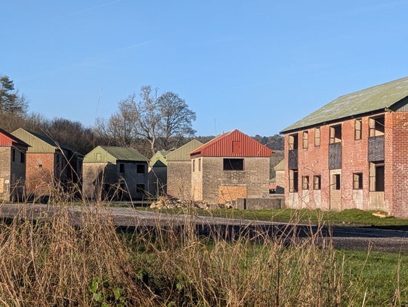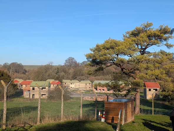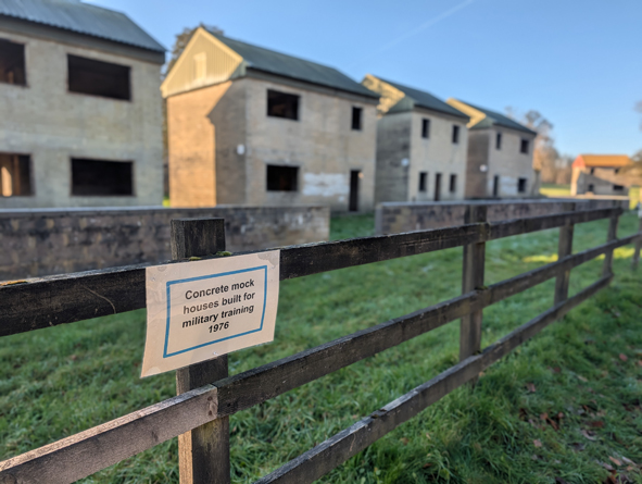 Only a handful of the old village buildings remain as shells – a couple of farmhouses, The Bell Inn and Imber Court (large manor house) which has been fenced off with the machine gun turrets still in place at each corner of walls.