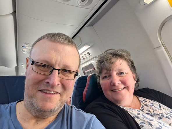 Jon had checked us in the day before … whether he was too quick, but we’d been allocated seats at the back of the plane! No option to choose seats! At the check in machines, the screen gave us the option to switch seats. He tried to move us to the emergency exit seats (at cost), but the system wouldn’t process this. Next was the baggage drop. My suitcase was impressively underweight – just 19.4kg. It was whisked off quickly. Jon however, was 23.4 kg and rejected by the baggage drop so we needed to see the check-in staff. Suitcase weighed again and they accepted it without any charge!