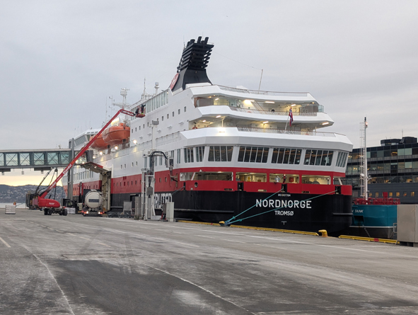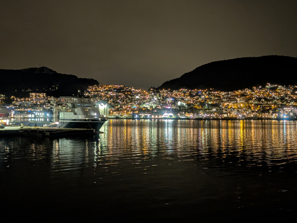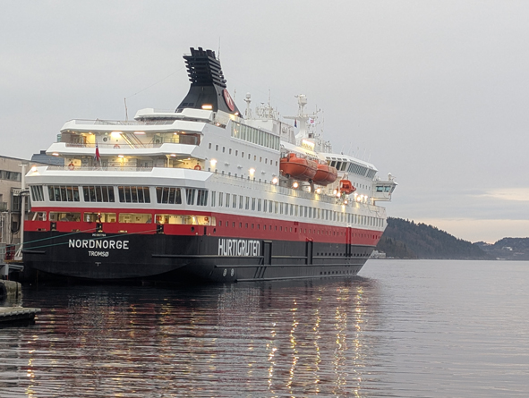 By the time we’d cleared passport control and walked the mile to baggage reclaim, luggage from the plane was already going around the carousel. Now to find the bus that would take us to the Hurtigruten Terminal. We headed outside and joined the queue. We were told this bus was full and we needed to wait until the next bus. It was noticeably colder than England but not freezing.