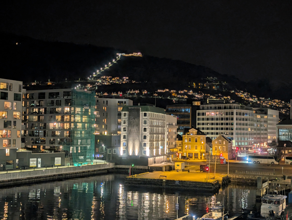 We didn’t have too long long to wait. A little confused as some seats seemed to be folded over, but once we’d sat down and looked at them more closely, they were actually baby seats. Quite cool. Traffic heading into Bergen was really busy and slow moving. The bus driver eventually came on to explain that something had happened in one of the tunnels so all traffic was heading this way. Because it was so busy, he decided to reverse the drop-offs, so instead of being the last stop, we were now first (and ahead of the people that were on the earlier bus!