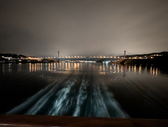 From previous visits to Bergen on cruise ships, we knew we would pass under a bridge about 30 minutes after leaving Bergen, so we were some of the few that toughed it out until then.