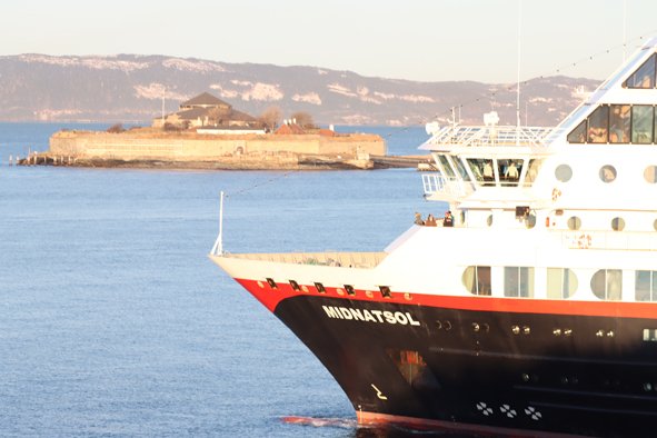 We managed to grab a bite to eat in the buffet before we sailed out of Trondheim. We needed to sail out the way we came so were heading back past Munkholmen and up the Trondheim fjord. Remnants of World War 2 Munkholmen was still evident. Guns were visible at the back of the islet and what looked like tank (probably a gun bunker) was visible once you’s past the island.