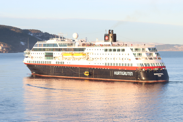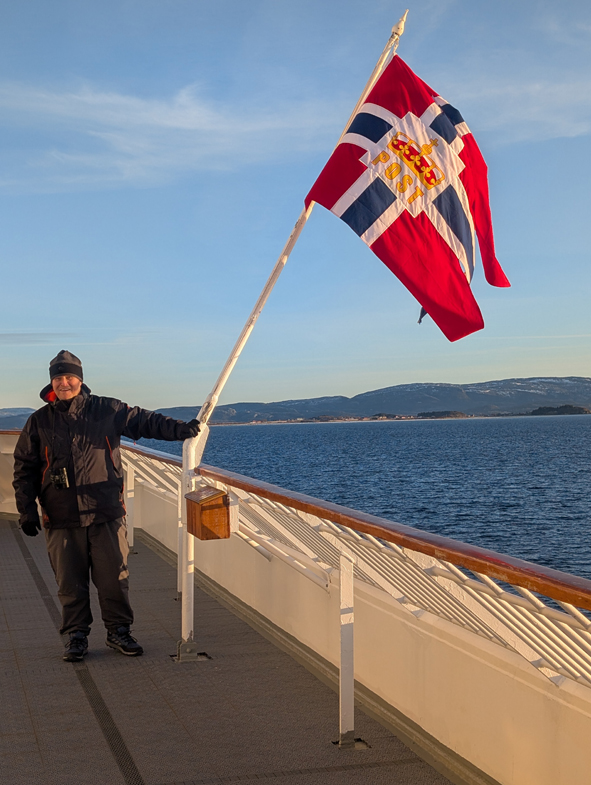 Just as we were approaching, the captain sounded the ships whistle and made every jump! We were passing another Hurtigruten ship, Midnatsol, that had just left Trondheim. They replied and all the passengers were up on deck waving their Norwegian flags at us. Just hand waving back from us – as the expedition team needed to be down on the pier as soon as we docked to sort the excursions out, they wouldn’t have time to collect them all back in. Likely we’ll pass one ship each day as they all leave a day apart.