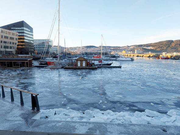 We left the Hurtigruten terminal and walked by the harbour – this was half frozen over. Towards the middle of the harbour was a small pier with what looked like saunas sited along. No dip in the icy waters unless you broke the ice first!