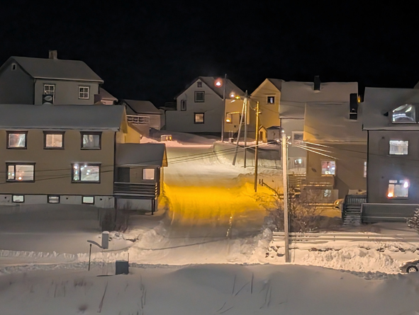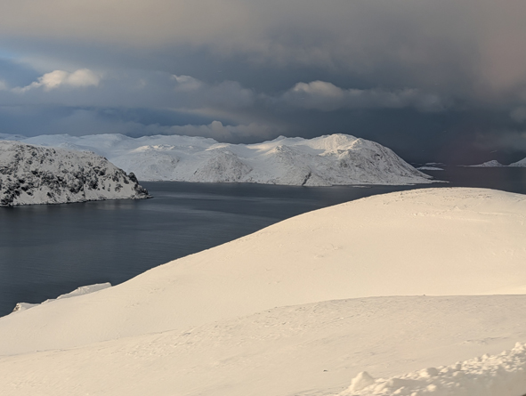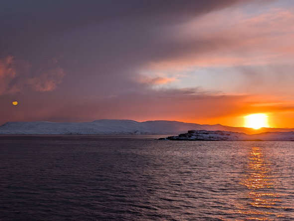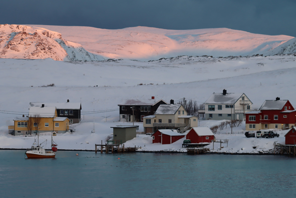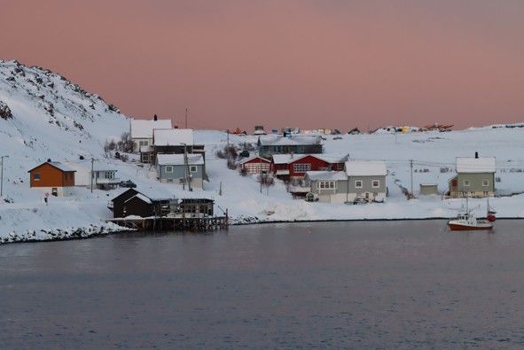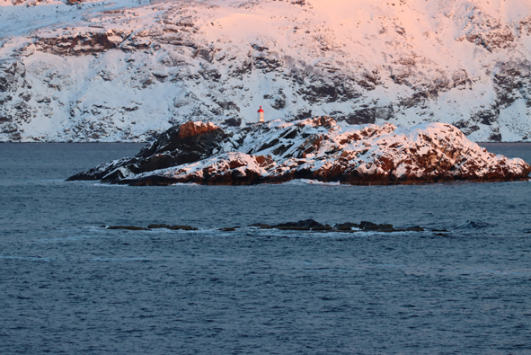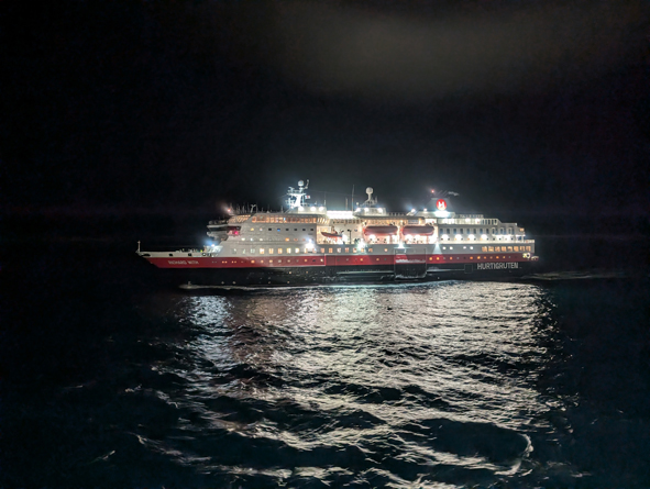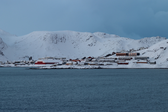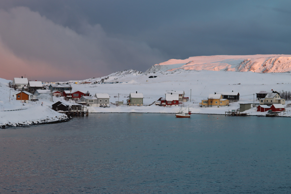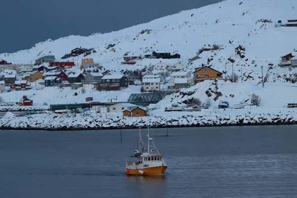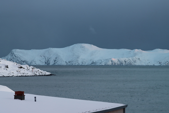 We stopped at Mehamn at 18.55 for 15 mins or so – nothing taken on/off the ship by the forklifts, but we picked up the passengers who had been on their snowmobile excursion from Knøllefjord. As soon as they were all onboard, we were on our way.