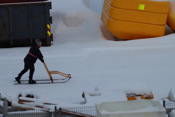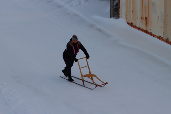 We did see one lady getting around by a sled / scooter contraption. Seat on the front and she was stood on two ski rails and scooted along by pushing off with one foot.