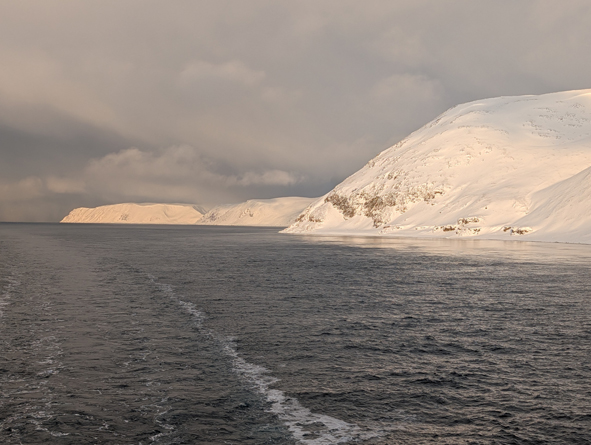 We pulled away from Honningsvåg and almost as soon as we were onboard. Almost immediately, the boat started pitching. The seas weren’t really rough, but it was nice to feel some motion so you know you’re at sea.
