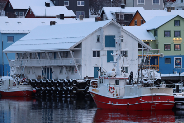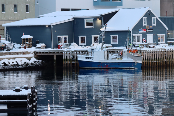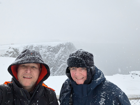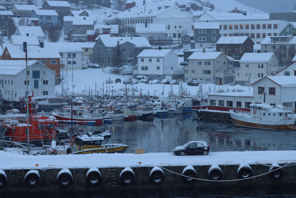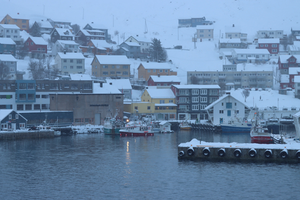 On arrival in Honningsvåg, it looked to be a really pretty town; had we not booked the trip, it would have been lovely to explore. Yes, there was the industrial dock and the warehouse but to the right was a little harbour surrounded by shops and houses. There had been fresh snowfall over night – the deck and rails were covered and shore-side everything looking white and pretty … and the locals driving around without any problems on the compacted snow.
