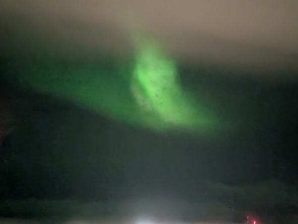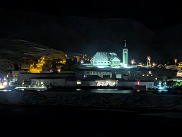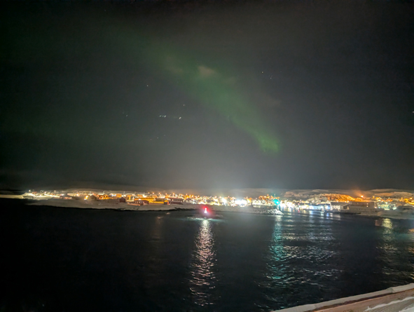We were in luck with the Northern Lights again tonight – the grey wisps appeared as we approached Berlevåg and they hung around until we left port. Not terribly strong, but can to life through the camera lens.