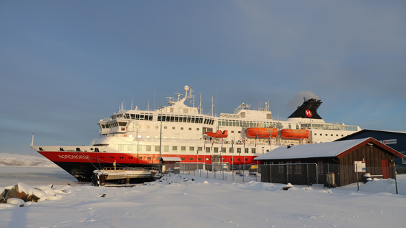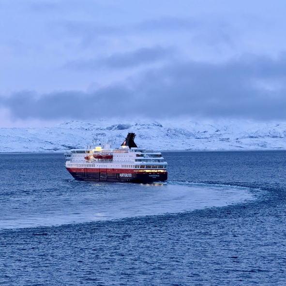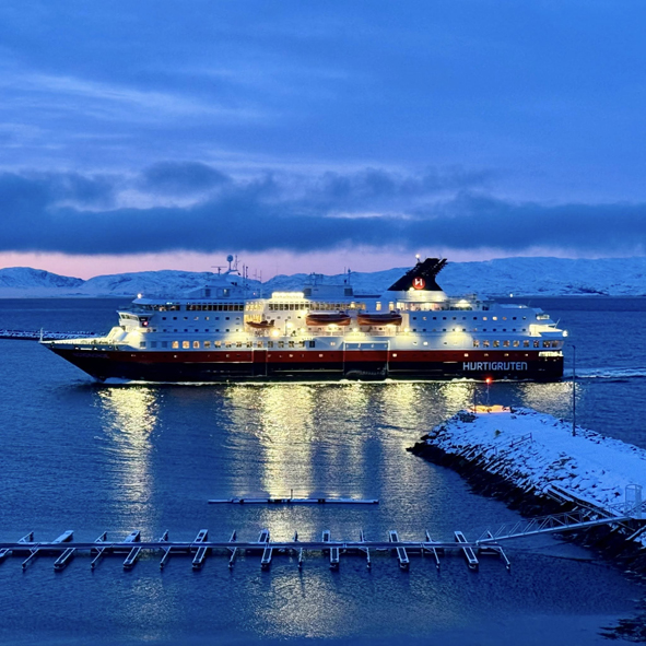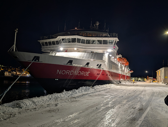 Overnight Nordnorge stopped in Vardø and Vadsø. Ships only stop at Vadsø on the Northbound route, not the Southbound – 34 ports on the way up but only 33 ports on the way back down. Whilst we weren’t up to watch the sail-in, a local lady, Anita Isaksen, captured our ship heading in and out of Vadsø and shared them to the Facebook Group.