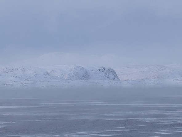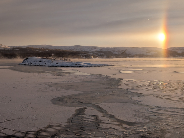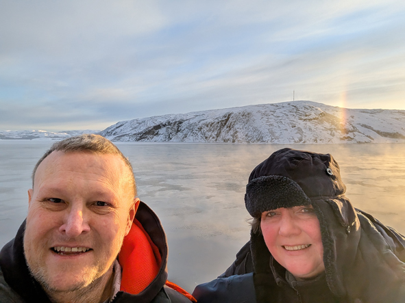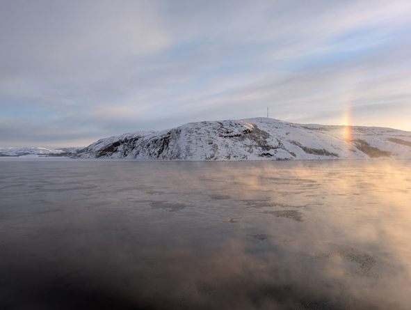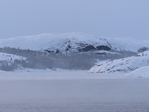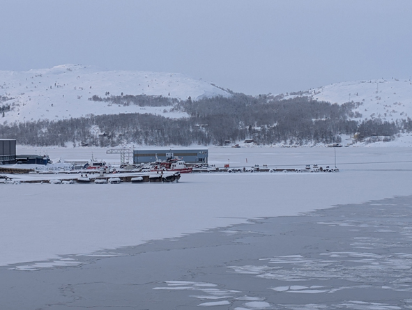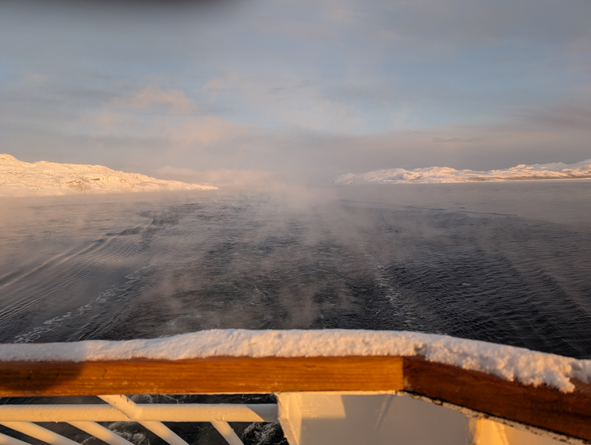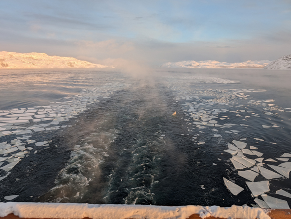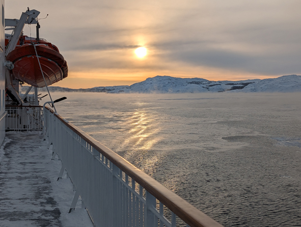 We were up on deck to watch the sail into Kirkenes and it was stunning. Temperatures were cold – around -22C and the sea approaching port had started to freeze over. The ships coming into port keep breaking the ice up and the gulf stream helps the sea from completely freezing over.