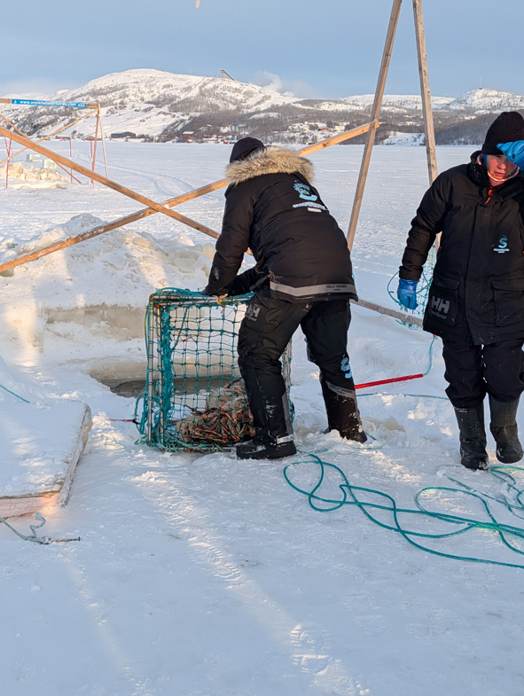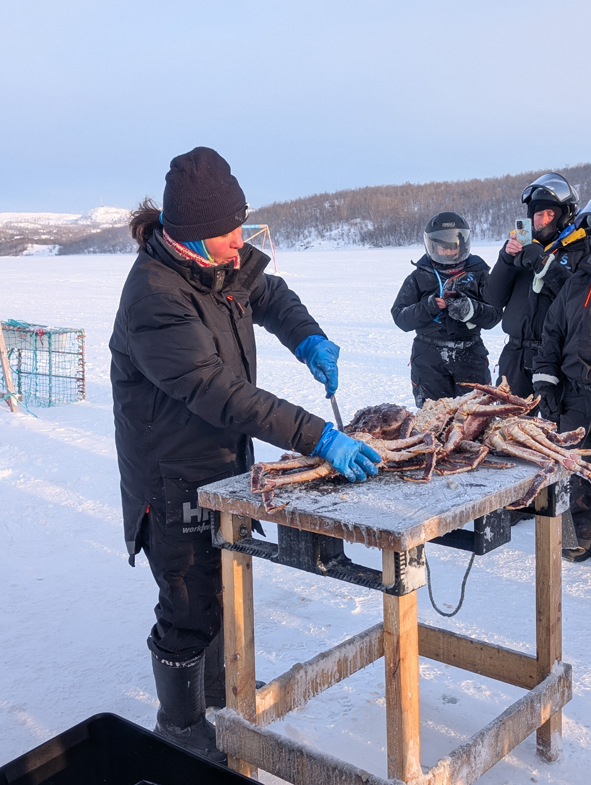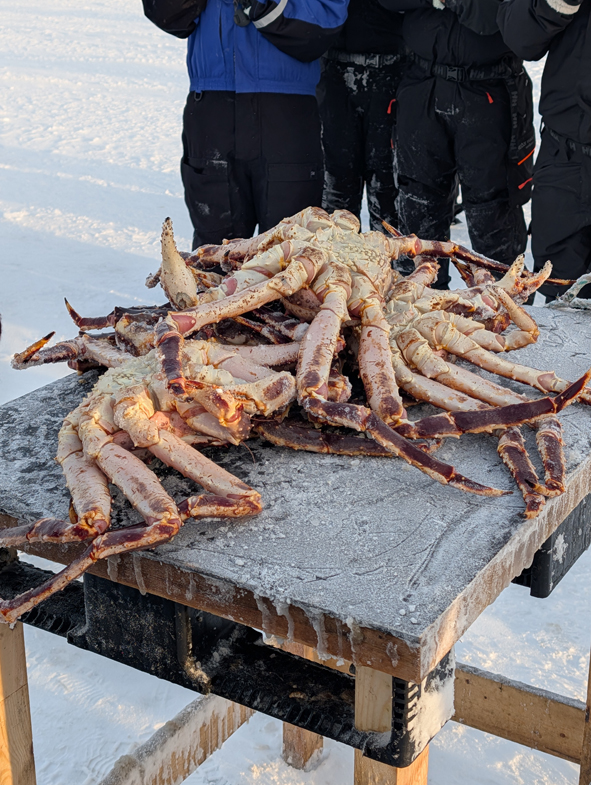 Once we arrived, we all disembarked. Patricia and the other guide opened up the hole in the ice and then started hauling the cage up with the King Crabs in. The only ones that can be eaten are the smaller crabs. They can grow up to 2 metres in leg span. Any females caught need to the thrown back into the water.