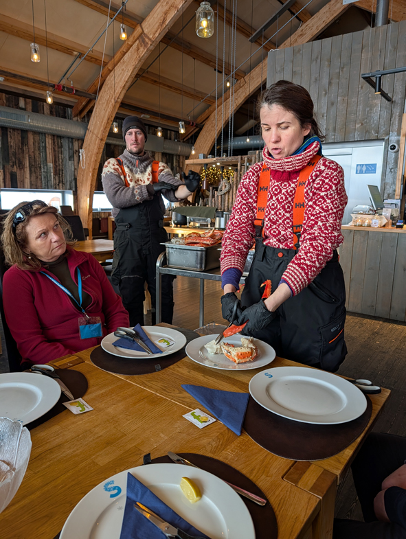 Not sure if they had preloaded the cages with just the right amount of King Crabs for the group or just lucky! Patricia then took out her knife and deftly killed the crabs. The crabs are known as King Crabs as they French call them [Crab] Royale – Royal Crabs – because of their Blue Blood. Patricia did warn us they will still move for up to 20 minutes afterwards.
