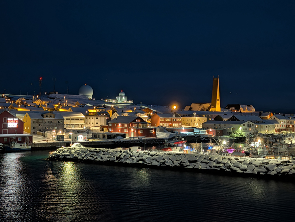 We made it out on deck to see the lights as we approached Båtsfjord. Not as bright as previous nights but the grey swirl was visible with the green becoming visible via the mobile phone camera. We stayed out until we came into dock at Båtsfjord – whilst at sea, the wind was bitter so we tried to take a little shelter whilst out on deck. It was funny trying to walk to the front as the wind was so strong you could barely step forward. Anyone on the petite side was in real danger of being blown over!