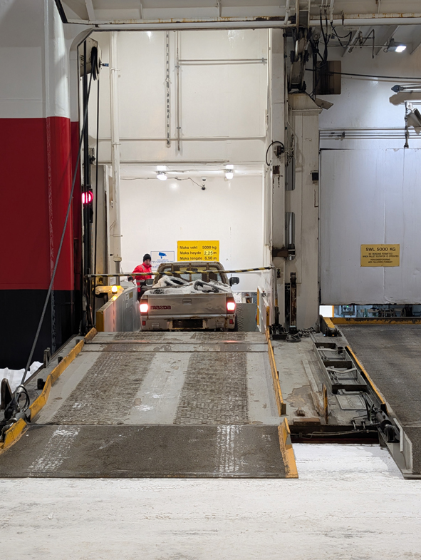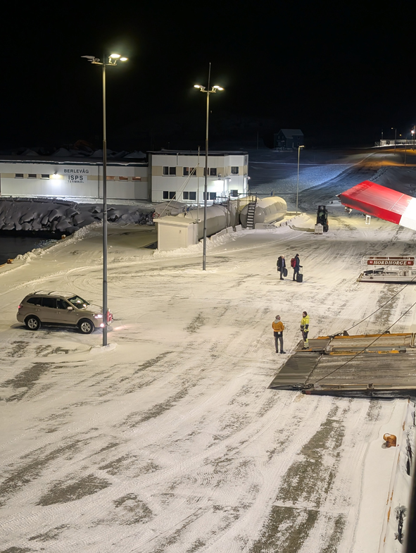Our next port of call was back at Vardo. We stopped here earlier today when we were asleep!. We wrapped ourselves up and headed back out on deck to watch the sail into Vardo. It did make up chuckle that the first thing you see was a great big sign saying “Make the North Great Again!” The town was spread out around the harbour. We were docked up for 55 mins. We headed off the ship to take some photos of the ship but decided not to venture into town to see what was there. Jon was fascinated and watched how the brought cars onboard … they had a lift!!