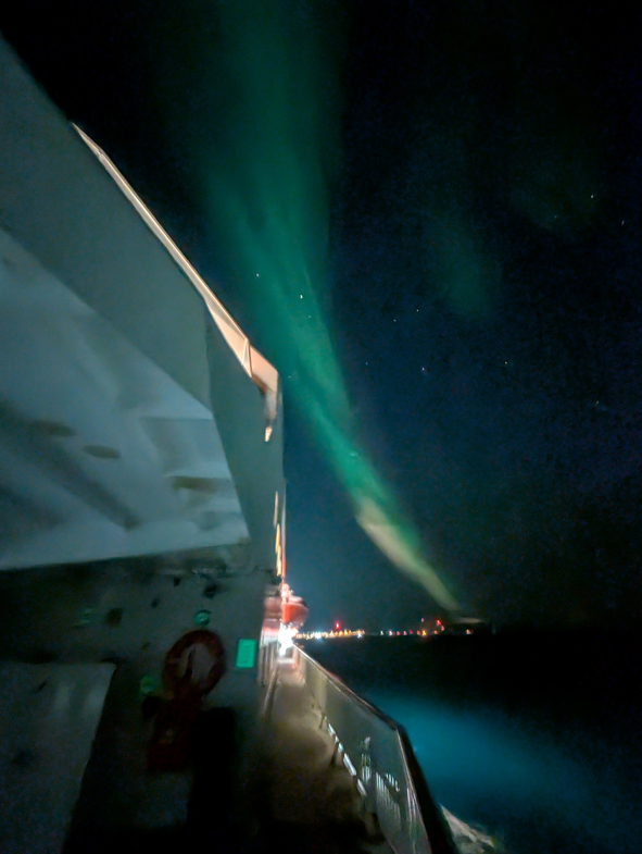 Back to the cabin to warm up – I went out on deck to watch the sail in to Berlevåg and the lights came out once more. I was feeling quite smug that I was out on deck and spotted them before anyone else. As soon as the bridge spots any Northern Light activity, they do broadcast out to all cabins. There’s a setting on the cabin phone that allows all these announcements between 8am-10pm to come through into your cabin so you don’t miss anything.