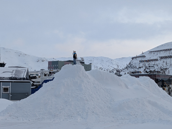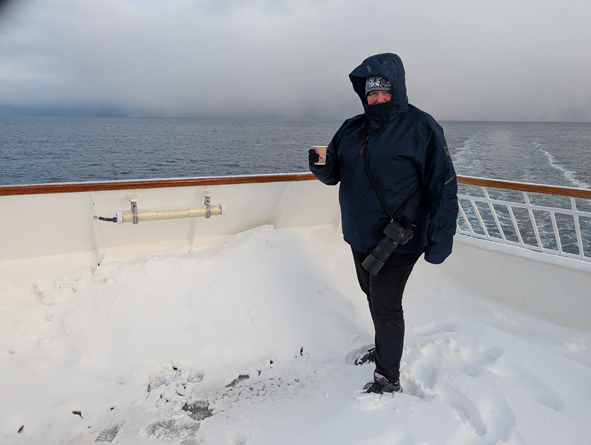 An impressive amount of snow had landed on deck this morning and where the snow had drifted, it was a little icy in places. David (Expedition Team) tested and nearly fell over!