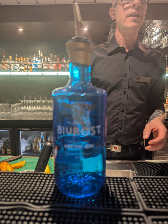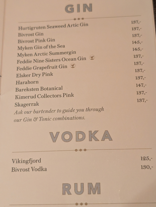 One final drink up in the Explorer Lounge tonight before bed. After a wonderful meal, I decided a G&T would round the night off perfectly. Jon went to the bar to order me a Hurtigruten Seaweed Arctic Gin, but the barman informed him that the ship had jumped the gun with the printers and they hadn’t received any stock yet onboard! The barman and Jon decided I needed to go to the bar to decide on an alternative – they didn’t want to get in trouble. I wanted an authentic Norwegian Gin and went with the barman’s recommendation of the Bivrost Gin. He also said to try a sip neat before adding the tonic to get the full flavour. Jon had a beer – it’s actually really good (I tried one the following day and enjoyed it!).