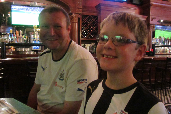 It arrived during half time and I have never seen a bacon butty like the one Callum had. Huge doorsteps of bread … but the bacon filling was twice the thickness of the bread … and served with chips!! The Newcastle game was very entertaining – Newcastle unlucky not to get the 3 points. After the game, we went downstairs to see where everyone else was. A giant Toon Army flag on one side of the room and an AVFC flag to the other. The guys insisted on having a Toon fans photos in front of the flag … Chelsea fans also had their flag on display ready for their match against Leicester that was about to kick-off.