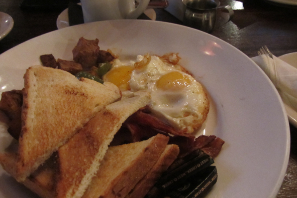 Bright and early we set off, keeping fingers crossed that we’d be able to get breakfast too. The bar seemed remarkably quiet but the barman spotted Jon and Callum’s shirts and duly obliged by switching the TVs near us to the Newcastle game. It soon became obvious there were more fans spirited away down below as cheers and gasps followed the action. Breakfast was available; Callum went for the Irish Bacon Butty, Jon for the eggs, toast and sausage and for myself the eggs, bacon and toast.
