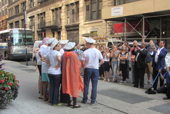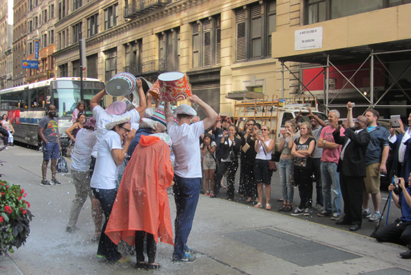 After Central Park, it was time to head back to the hotel. We got back to the hotel only to find all the staff outside – they’d been nominated to do The Ice Bucket Challenge – a craze taking off over here with celebs tipping a bucket of iced water over their heads. As they were on duty, shower caps were donned, but about 15 staff took part.