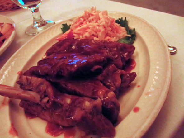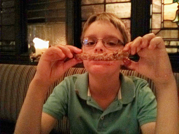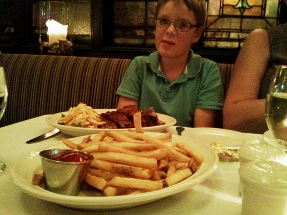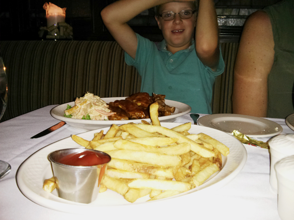 We weren’t overly hungry so Callum had a starter of ribs for his main course, Jon had fillet of sole topped with crab and I had the Cobb Salad with grilled chicken. Yum!! Callum enjoyed his ribs as sauce was all over his face!