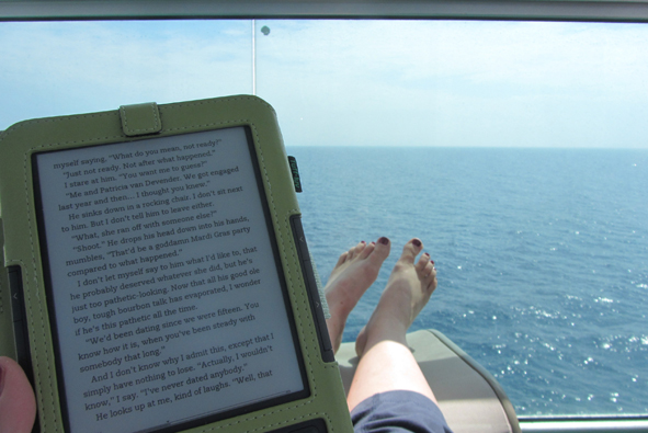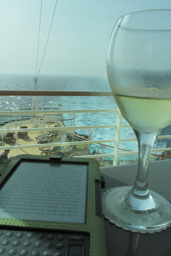 The sun was on our balcony this afternoon so we sat out in the sun and caught up on some reading for a couple of hours. When it started to get cold, we moved up to the Planet Bar and sat overlooking the wake. Great fun to pretend your reading whilst ear-wigging into fellow passengers conversations! One section of the bar was closed off for a private function – a wedding.