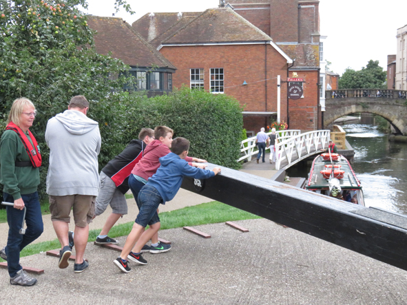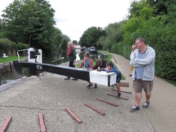 They watched the large enter the lock and then listened whilst the lady explained why they only opened certain parts to let the lock refill – so the barge wasn’t buffeted in the lock. They were then allowed to open the gates to let the barge out and continue on their way down the canal.