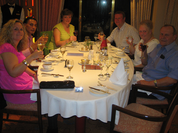 We were dining in The Medina Restaurant, Table 76 which was next to a window (not that we could see an awful lot at by 8.30pm it was well and truly dark). The first meal was lovely. I had Carpaccio of Duck with an apple and walnut salad whilst all the others had risotto. It was a tough choice to make between mushroom soup or beef consommé, I choose the former, Jon the latter. For mains, Jon tried the Poachers Pie (partridge, venison & ???) whilst I opted for salmon. The white choc and raspberry soufflé was far too tempting for Ray and I to resist and Jon and Nic opted for cheese & biscuits.