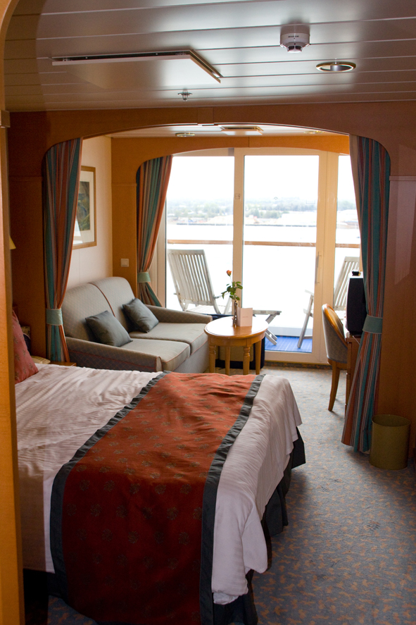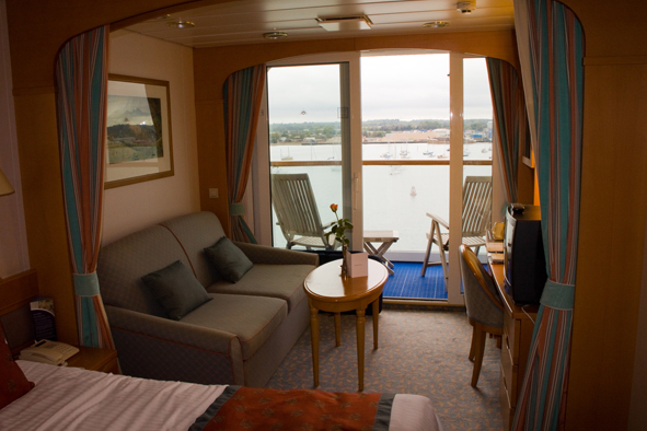 Once we’d finished lunch, the cabins were ready so headed down to check ours out. We’d booked a Deluxe Balcony cabin on Britannia deck – Cabin B219. We were really impressed as it was probably more spacious than the mini suite we’d had on Oceana (and more storage space too!). The was a large sofa bed for Callum, and a lovely big bed for us. Decent size balcony with two chairs and a little table. Bathroom has a bath/shower in it. A very large wardrobe and chest of drawers plus other cupboards/draws in the cabin too. It really does feel very spacious.