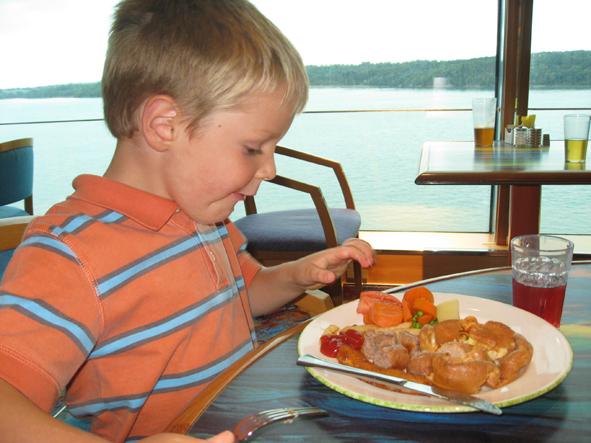 After kids briefing, it was kids tea – Callum ate loads – fish finger, sausage, Yorkshire puds, carrots, peas, spaghetti hoops, a handful of chips and a boiled potato. This was followed by a cake and a biscuit and a couple of spoonfuls of jelly.