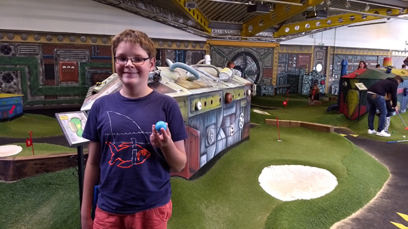 We can never find our way back to Junction 15, so we were heading towards Junction 16 when Callum spotted an Indoor Crazy Golf place and decided that would be something fun to do. The Golfing Hole was on an industrial estate along with what looked to be a large soft play area. Car parking at these places is always very limited and this was no exception – we had timed our arrival well as someone was just leaving. It was really well done (even done to ensuring everyone has different colour balls to prevent arguments!) and it was actually really good fun with some rather tricky holes!