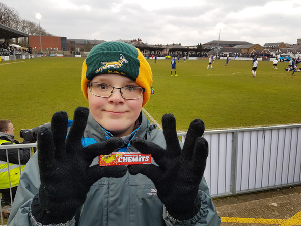 It was really cold with snow starting to fall but nothing that would stop the match. We grabbed a hot drink at half time and I was impressed to see that they were selling Chewits. Callum couldn’t understand why I thought this funny – those of a certain age may remember the ad from the 1980s! He happily munched his way through a packet though.