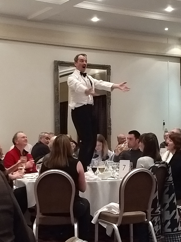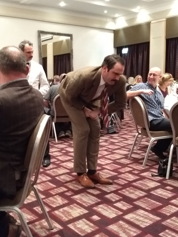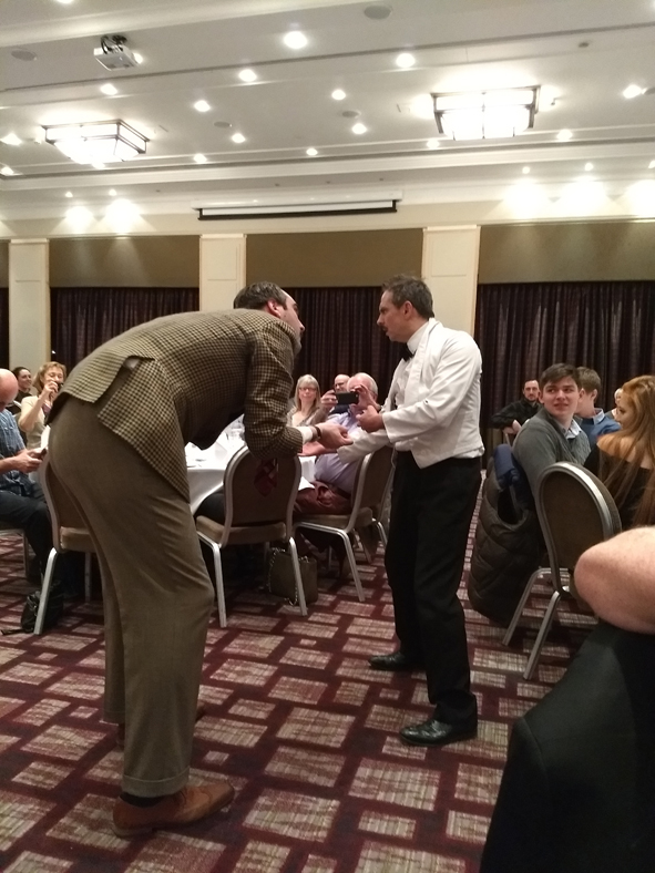 I won’t go into specifics as this will spoil the evening for anyone that decides to give the evening a go. A fair bit was obviously scripted but some was improvised depending on the audience. Suffice to say that Jon and Callum were the first to be picked on and the show incorporated lots of much-loved references to the shows (rats, Germans, Waldorf salad all featured). The three actors were brilliant with their characterisations, impersonations and even smells (Sybil and her cigarette aroma!) and worked well around all the tables, picking on people (especially those with birthdays!)