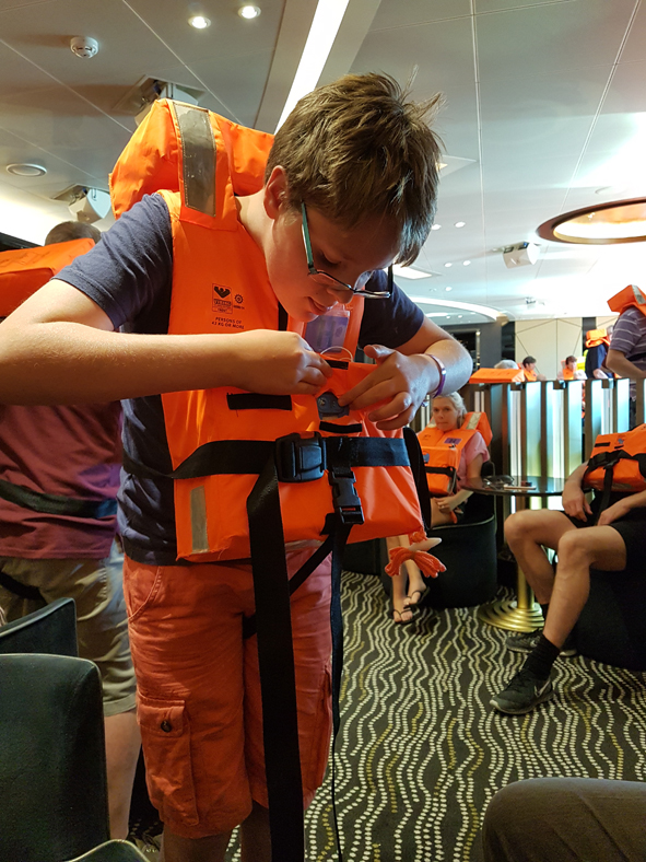 Next job was to unpack and settle into the cabin. Plenty of storage for a week long cruise and just about got this done before Muster Drill. As we were right at the very back of the ship, our muster station was in The Live Lounge – a show lounge right at the back of the ship.