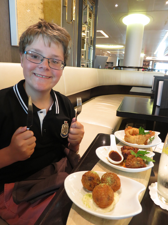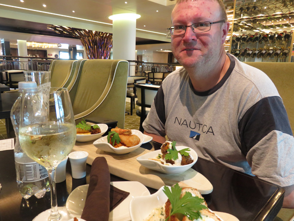 We collected Callum from Kids Club where he had got 14/15 on the Movie Quiz (someone got 15!) and headed to the Glass House for lunch. A set of tasting plates all round. I tried a glass of the New Hall Bacchus – it was OK – quite refreshing but very different from the wines I usually drink. All really good – it’s one thing we really enjoy on P&O!