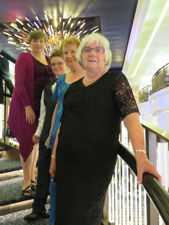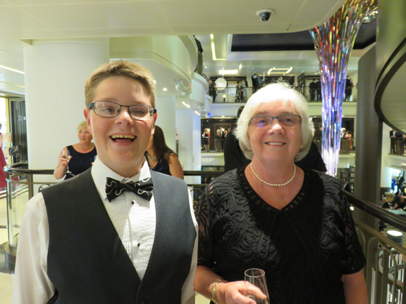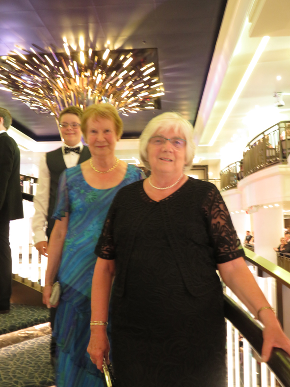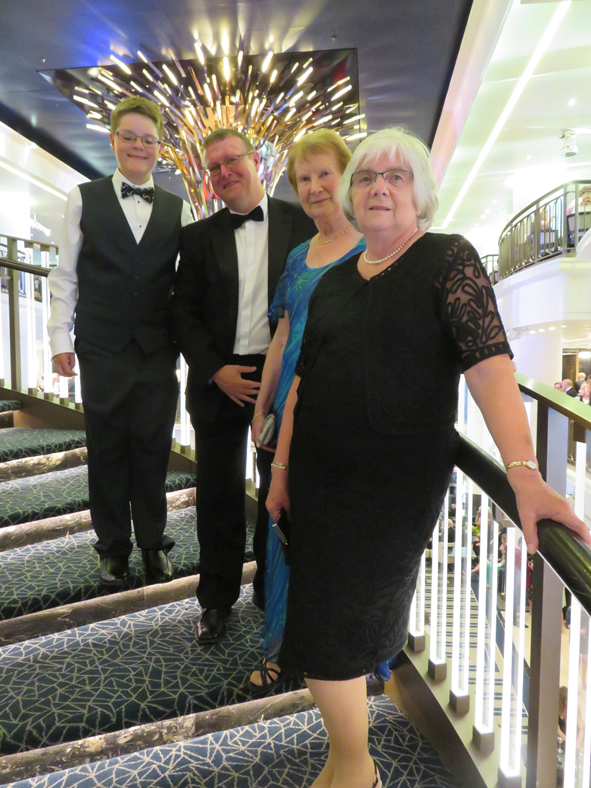 Back to the cabin and time to get ready for our first formal night. We met up with Ann and Mum in the atrium, trying to find a spot where we would be in easy reach of a drinks tray. There were numerous photo stations set up on Deck 7 around the atrium so this was harder than it sounded. In the end we went down onto deck 6 – not brilliant but a steady flow of waiters passing by. Prosecco, G&Ts and orange juices snaffled and we waited for the Deputy Captain to make his appearance. As it was still foggy, Captain Dunlop remained on the bridge with other senior officers.