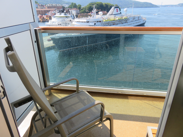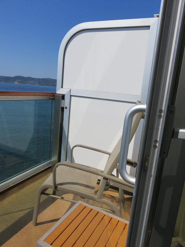 The balcony was a good size, although it does tend to get soot landing on the balcony and seats so be careful when you sit down. We just took the blue towels out with us which worked fine. The cabin steward does wash these balconies down of a morning which helps.