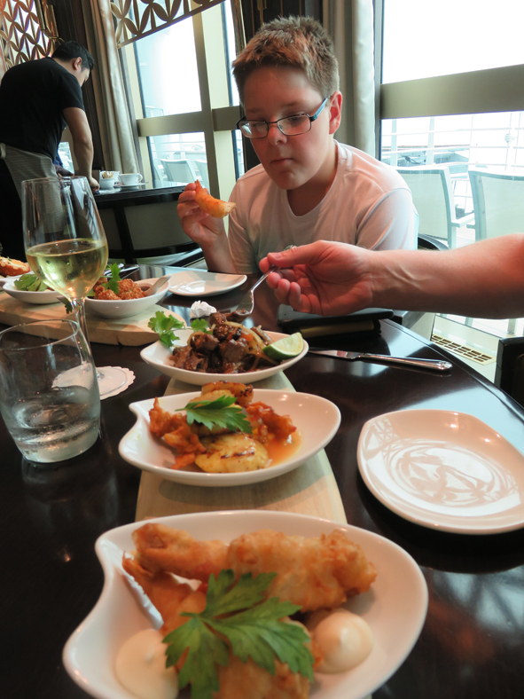 Being the last full day on-board, alas this also meant we needed to pack. We headed back to the cabin to make a head-start … before heading down to the Glass House to meet Mum and Ann for lunch. The lovely Glass House waiters found us a large round table in a section set aside for diners. The view onto the outside balcony showed us it was raining … and still pretty foggy.