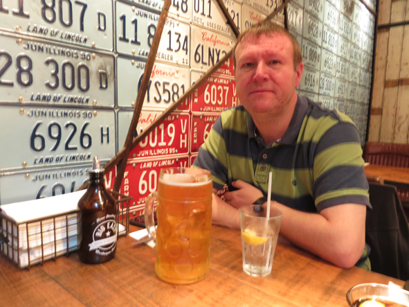 Lunchtime was beckoning and we ended up back at one of our old favourites – The Big Easy. A great deal on the lunch time menu – £10 for lobster and shrimp roll with a drink. Jon’s beer was a little on the large side!