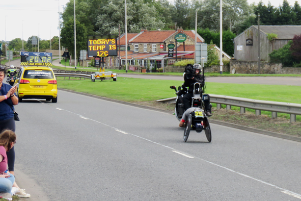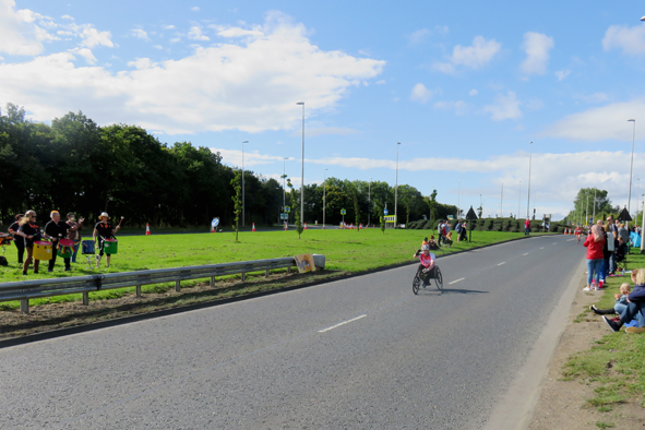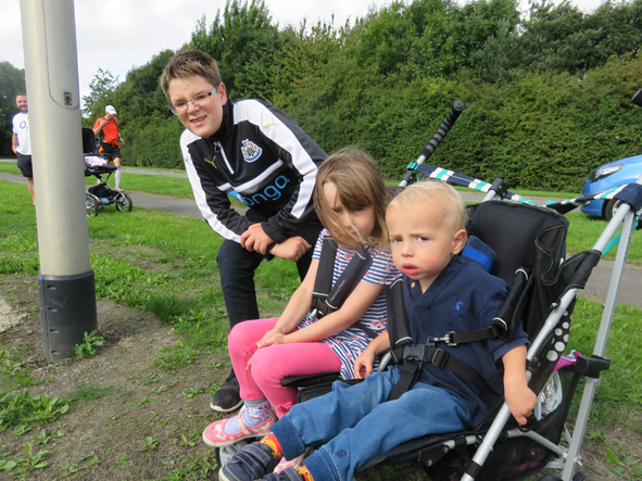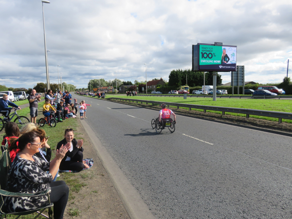 The plus side of being in here this weekend, is that we go and support Mick as he was taking part in the wheelchair race to raise money for Breast Cancer Care. The halfway point on the course comes really close to Gran and Granda’s house. We found out the approx. time Mick was planning to be at this point and headed down to see him. We bumped into Mick’s family so at least we knew we wouldn’t miss him!