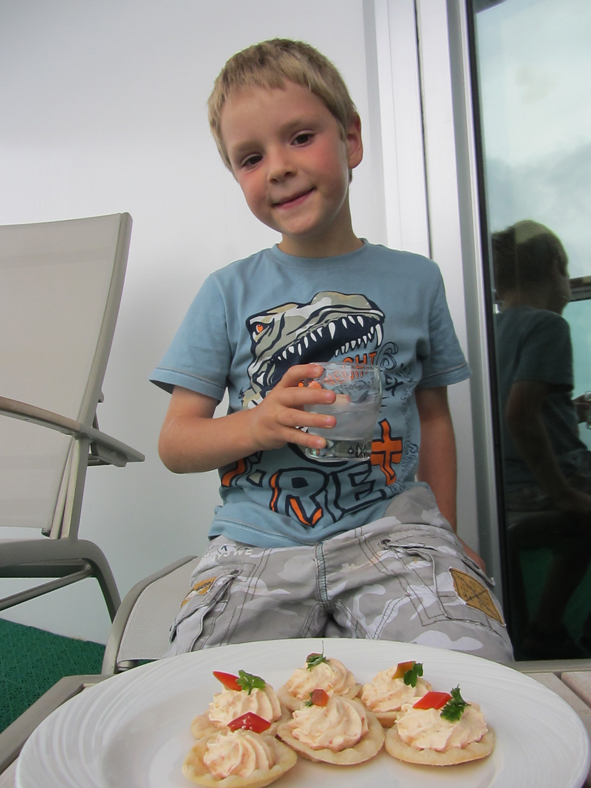 Back to the cabin to get ready for this evenings formal night. We had canapes delivered to the cabin this evening (on every formal night) and Callum thought this was an extra treat for him!