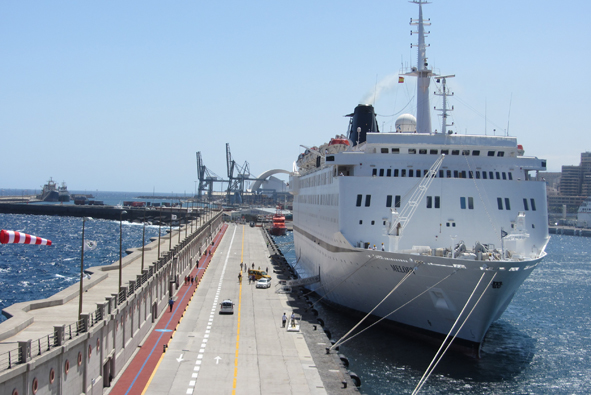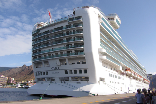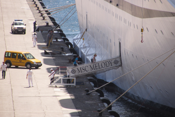 Best entertainment of the cruise so far was seen from our balcony. MSC Lyrica had docked behind us and was due to set sail for Madeira at 3.30pm. The cruise seemed to be full of Italians … and a fair few were still strolling up to get back on board at 3.35pm. After this time, passengers laiden down with shopping bags could be seen running down the quayside to get back onboard. The the P&O shuttle bus stopped to drop two more passengers off just before the gangplank was raised at 4pm! Alas we didn’t see any passengers turn up AFTER she’d set sail though.